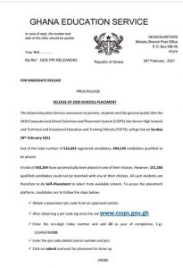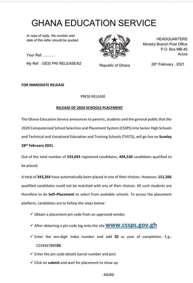 GES further announces that the 2020 computerized School Selection and Placement System (CSSPS) into Senior High Schools (SHS) and Technical and Vocational Education and Training Schools (TVETS) will go live on Sunday February 28, 2021.