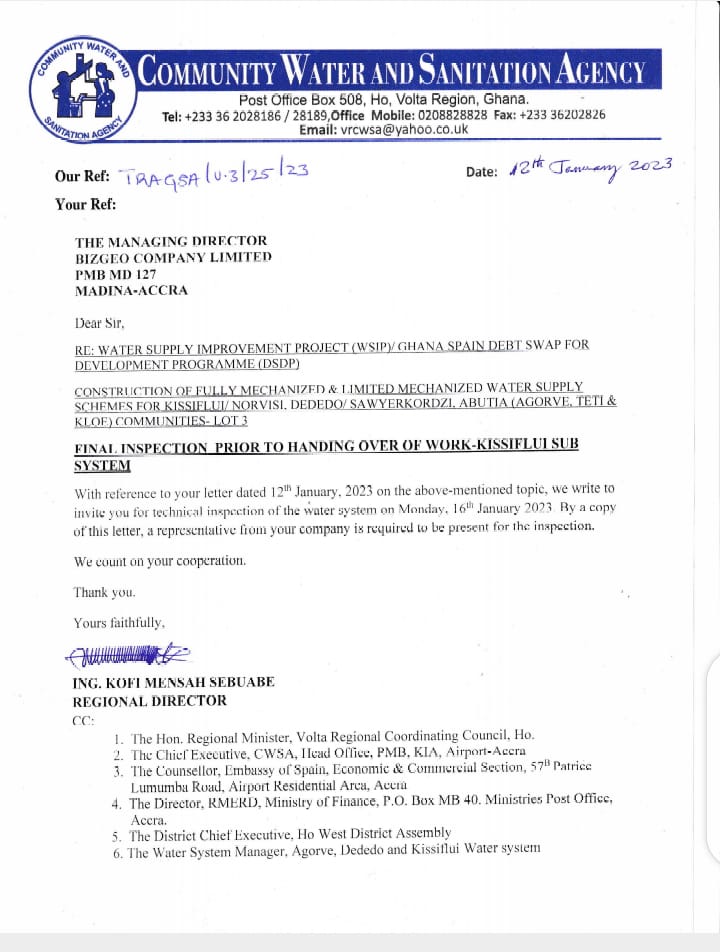 In a letter dated January 12 and signed by the regional director of Volta CWSA Mr. Kofi Mensah Sebuabe, the CWSA invited representatives from the various offices to be present at the site for its final inspect before it is handed over to the Abutia Kisifli sub system.