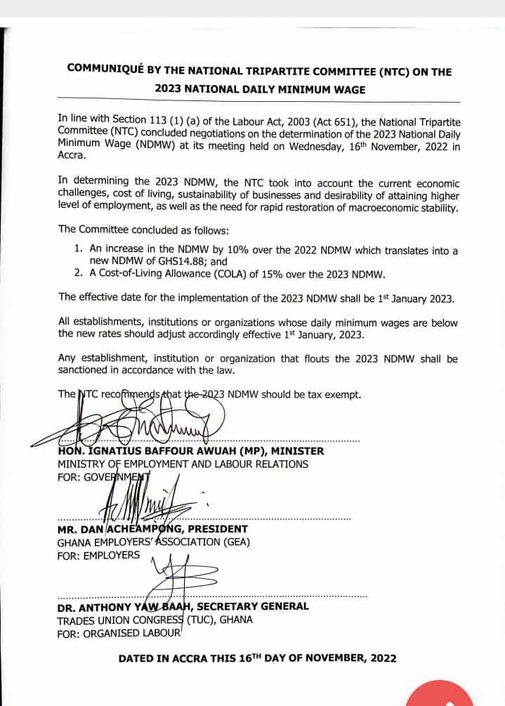 In a communique signed by the Minister of employment and Labour relation Hon. Ignatius Baffuor Awuah, Mr. Dan Acheampong-the president of Ghana Employers’ Association and Dr. Anthony Yaw Baah-the secretary general for Trade Union Congress (TUC) has indicated 10% increments to NDMW effective January 1, 2023