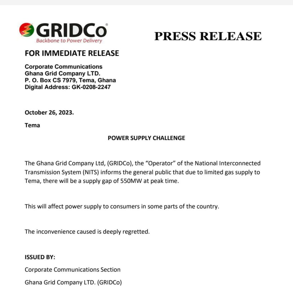 Contained in a press statement dated October 26, 2023, the Ghana Grid Company Ltd (GRIDCO) which is the operator of the National interconnected Transmission System, gave hint on expected outage due to what they described as limited gas supply.