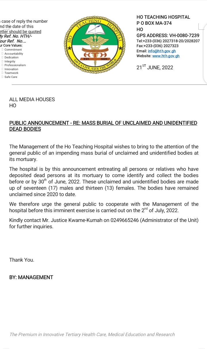 The Ho Teaching Hospital has set July 2, 2022 to take up a mass burial exercise of some unclaimed and unidentified dead bodies in the hospitals Mortuary.