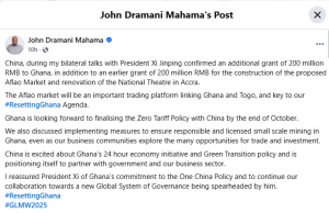 In a Facebook post on Thursday [October 16, 2025] President Mahama said the agreement followed his bilateral talks with Chinese President Xi Jinping, during which China confirmed the new grant in addition to an earlier 200 million RMB facility.