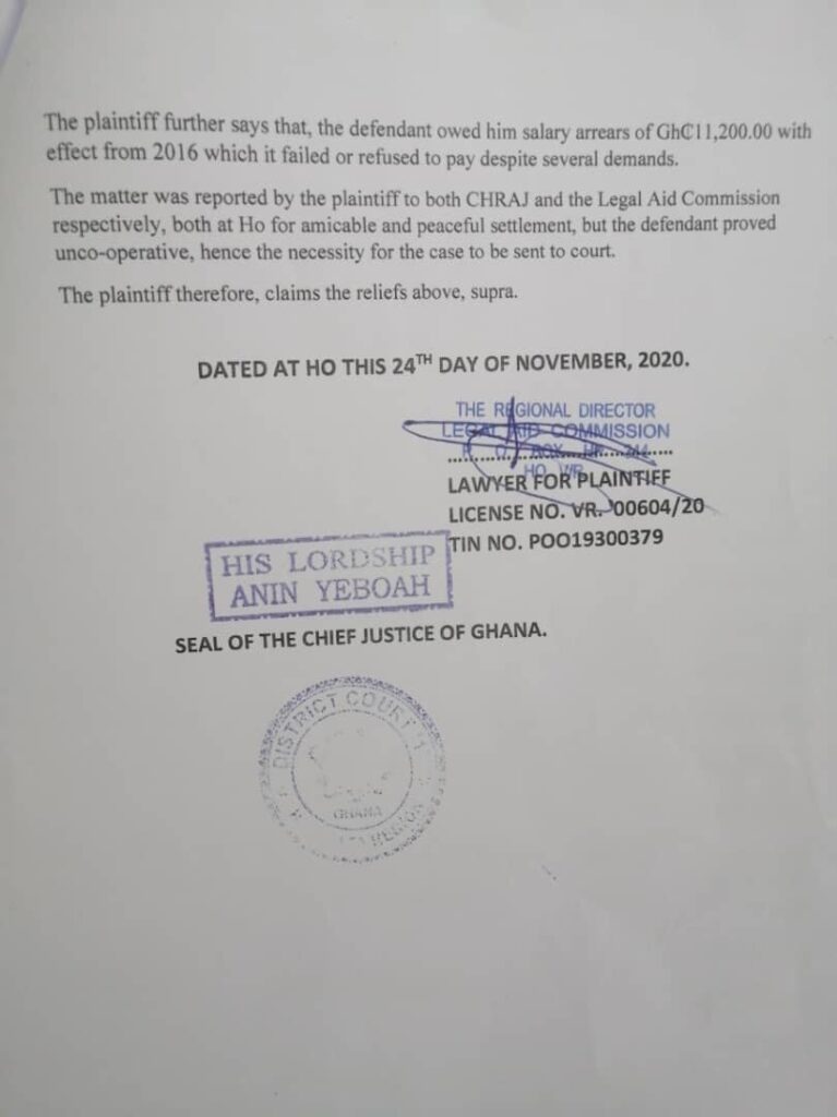 In the copy of writ of summon sighted by voltaonlinegh.com, the plaintiff Atitsogbui Kingsley prayed the Ho District Magistrate Court for an order of payment of an amount of GHc11,200.00 being arrears of salary owed him by the Defendant (Kekeli Radio) with effect from 2016.