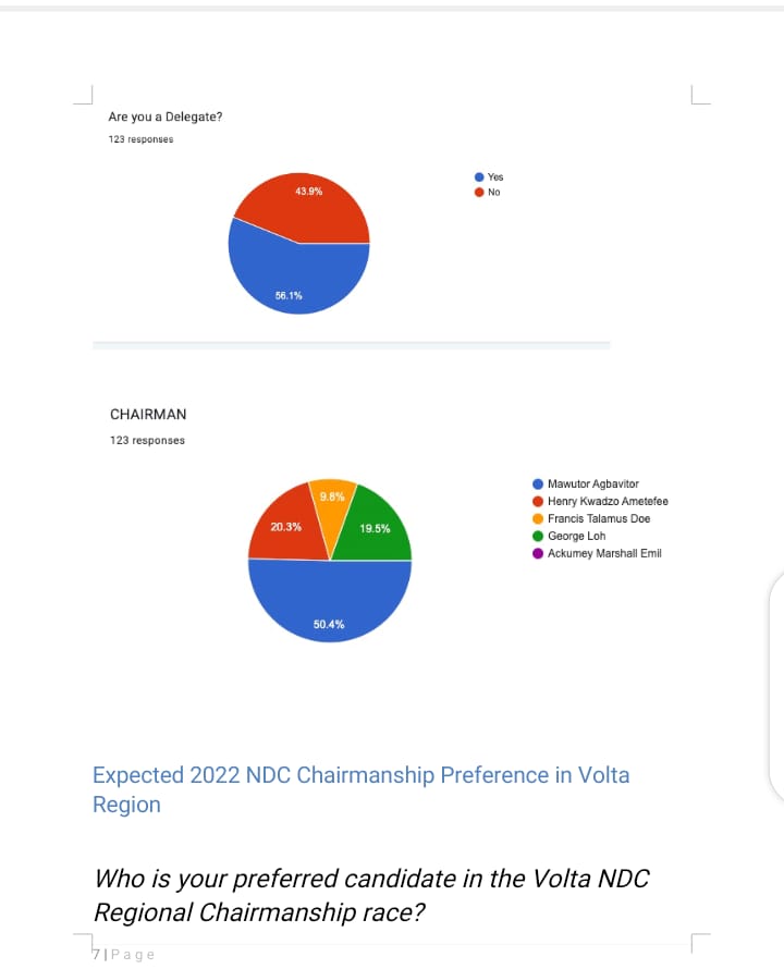 It said, Mr. George Loh has 19.5% vote and 9.8% is likely to vote for Francis Talamus Doe out of the 500 sampled stakeholders in Volta NDC.